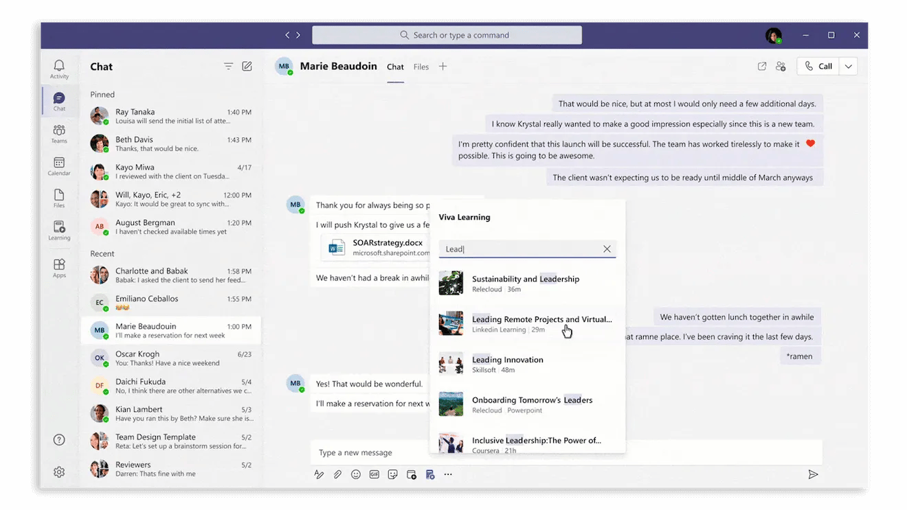 Help your people thrive at work with Microsoft Viva Learning, the central hub for learning in Microsoft Teams where people can discover, share, assign, and learn from content libraries across their organization—including LinkedIn Learning, Microsoft Learn, third-party content providers, and an organization’s custom content—allowing teams and individuals to learn and grow.